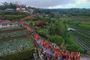Foto udara warga mengikuti parade 1.000 songket, pada Festival Pandai Sikek, di Nagari Pandai Sikek, Kabupaten Tanah Datar, Sumatera Barat, Sabtu (27/8/2022). Festival Pandai Sikek tersebut digelar Nagari Pandai Sikek dalam rangka memperkenalkan seni budaya dan produk khas daerah itu seperti tenun songket dan ukiran. ANTARA FOTO/Iggoy el Fitra/hp.