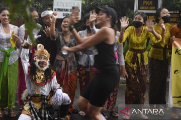 Peserta disambut kesenian tarian tradisional Bali saat Maybank Marathon 2022 di kawasan Gianyar, Bali, Minggu (28/8/2022). Sebanyak 10 ribu pelari dari 50 negara mengikuti Maybank Marathon 2022 yang memperlombakan kategori marathon, half marathon dan 10 K dengan total hadiah sebesar Rp 2,4 miliar. ANTARA FOTO/M Agung Rajasa/aww.