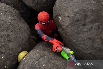 Seorang relawan dengan mengenakan kostum Spider-Man memungut sampah di sepanjang pantai Teluk Manila pada Hari Pembersihan Pesisir Internasional di Kota Pasay, Filipina, Sabtu (17/9/2022). ANTARA FOTO/REUTERS/Eloisa Lopez/rwa.