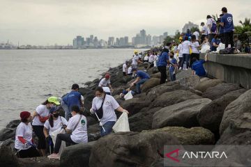 Sejumlah relawan memungut sampah di sepanjang pantai Teluk Manila pada Hari Pembersihan Pesisir Internasional di Kota Pasay, Filipina, Sabtu (17/9/2022). ANTARA FOTO/REUTERS/Eloisa Lopez/rwa.