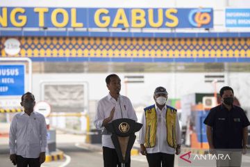 Presiden Joko Widodo (keempat kiri) didampingi (kiri ke kanan) Menhub Budi Karya Sumadi, Gubernur Jabar Ridwan Kamil, Menteri PUPR Basuki Hadimuljono, Menteri BUMN Erick Thohir dan Kepala BPJT Danang Parikesit mendapat penjelasan dari Dirut Pelindo Arif Suhartono (kanan) saat peresmian Jalan Tol Cibitung-Cilincing dan Serpong-Balaraja Seksi 1 di Gerbang Tol Gabus, Kabupaten Bekasi, Jawa Barat, Selasa (20/9/2022). Presiden Joko Widodo meresmikan Jalan Tol Cibitung-Cilincing sepanjang 27,2 Km yang merupakan bagian dari Jakarta Outer Ring Road (JORR) 2 serta Jalan Tol Serpong-Balaraja seksi 1 sepanjang 5,1 Km yang menjadi awal pembangunan JORR 3. ANTARA FOTO/Sigid Kurniawan/wsj.