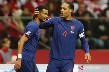 Pesepak bola Belanda Cody Gakpo (kiri) berselebrasi dengan rekan setimnya Virgil van Dijk usai membobol gawang Polandia pada babak penyisihan Grup D Liga Eropa di PGE Narodowy, Warsawa, Polandia, Kamis (22/9/2022). Tuan rumah Polandia bertekuk lutut di hadapan tamunya Belanda usai kalah 0-2. ANTARA FOTO/REUTERS/Kacper Pempel/wsj.