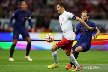 Pesepak bola Polandia Robert Lewandowski (kedua kanan) berebut bola dengan Pesepak bola Belanda Daley Blind (kanan) pada babak penyisihan Grup D Liga Eropa di PGE Narodowy, Warsawa, Polandia, Kamis (22/9/2022). Tuan rumah Polandia bertekuk lutut di hadapan tamunya Belanda usai kalah 0-2. ANTARA FOTO/REUTERS/Kacper Pempel/wsj.