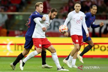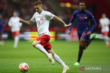 Pesepak bola Polandia Sebastian Szymanski menggiring bola ke arah pertahanan Belanda pada babak penyisihan Grup D Liga Eropa di PGE Narodowy, Warsawa, Polandia, Kamis (22/9/2022). Tuan rumah Polandia bertekuk lutut di hadapan tamunya Belanda usai kalah 0-2. ANTARA FOTO/REUTERS/Kacper Pempel/wsj.