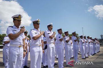 Perwira dan awak KRI Bima Suci-945 mengikuti apel kelengkapan sebelum bertolak menuju Darwin, Australia di Dermaga Cairns, Queensland, Australia, Sabtu (24/9/2022). ANTARA FOTO/Nova Wahyudi/aww.