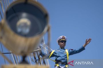Taruna Akademi Angkatan Laut (AAL) Tingkat III Angkatan ke-69 melaksanakan peran parade roll di atas KRI Bima Suci-945 saat akan bertolak menuju Darwin, Australia di Dermaga Cairns, Queensland, Australia, Sabtu (24/9/2022). ANTARA FOTO/Nova Wahyudi/aww.