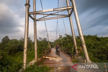 Pengendara sepeda motor melintasi jembatan gantung yang rusak di Rangkasbitung, Lebak, Banten, Minggu (25/9/2022). Jembatan tersebut konstruksi telah miring dan sebagian besinya mengalami kerusakan sehingga membahayakan bagi yang melintas. ANTARA FOTO/Muhammad Bagus Khoirunas/rwa.
