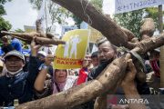 Petani yang tergabung dalam Asosiasi Pengelola Perhutanan Sosial Indonesia (AP2SI) Jawa Barat berunjuk rasa dengan memamerkan hasil tani di depan Gedung Sate, Bandung, Jawa Barat, Senin (26/9/2022). Aksi tersebut sebagai bentuk apresiasi terhadap Undang-Undang pokok Agraria dan menuntut pemerintah untuk menerbitkan Pergub serta Perda tentang skema pembiayaan penetapan tata kelola tanah objek reforma agraria dan perhutanan sosial hingga jaminan harga pasar kepada petani. ANTARA FOTO/Novrian Arbi/rwa.