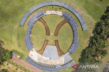 Foto udara panel surya pada Pembangkit Listrik Tenaga Surya (PLTS) di Kompleks Parlemen, Senayan, Jakarta, Selasa (27/9/2022). Pemerintah menargetkan kapasitas terpasang Pembangkit Listrik Tenaga Surya (PLTS) Atap pada 2025 mencapai 3.600 Mega Watt (MW) atau sekitar 3,6 Giga Watt (GW) sebelumnya menurut data Kementerian ESDM kapasitas terpasang PLTS Atap pada Desember 2021 tercatat sebesar 48,79 MW dengan jumlah pelanggan sebesar 4.794 tersebar di seluruh Indonesia. ANTARA FOTO/Galih Pradipta/aww.