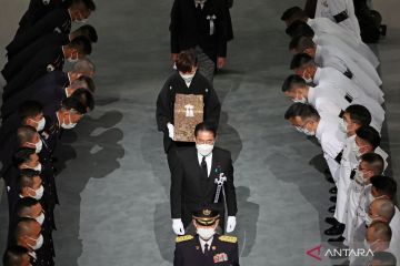 Akie Abe, istri mendiang mantan PM Jepang Shinzo Abe, membawa abu jenazah suaminya saat pemakaman kenegaraan di Budokan di Tokyo, Jepang, Selasa (27/9/2022). ANTARA FOTO/Takashi Aoyama/Pool via REUTERS/foc.