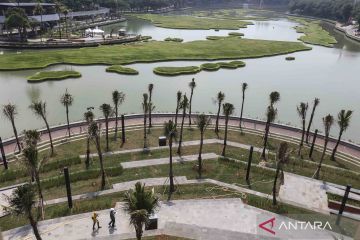 Pekerja berjalan di area danau di Taman Mini Indonesia Indah (TMII), Jakarta, Rabu (28/9/2022). Progres revitalisasi TMII telah mencapai 98 persen yang direncanakan akan menjadi salah satu lokasi yang dituju delegasi KTT G20. ANTARA FOTO/Asprilla Dwi Adha/wsj.