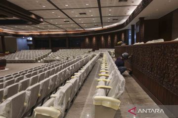 Pekerja menyelesaikan proyek revitalisasi gedung Sasono Adiguno di Taman Mini Indonesia Indah (TMII), Jakarta, Rabu (28/9/2022). Progres revitalisasi TMII telah mencapai 98 persen yang direncanakan akan menjadi salah satu lokasi yang dituju delegasi KTT G20. ANTARA FOTO/Asprilla Dwi Adha/wsj.