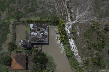 Foto udara kerusakan kawasan pertanian yang diterjang banjir bandang di Desa Linggajati, Kecamatan Sukaratu, Kabupaten Tasikmalaya, Jawa Barat, Selasa (4/10/2022). Seluas 75 hektare lahan pertanian di Desa Sinagar dan Indrajaya rusak diterjang banjir bandang yang diduga disebabkan aktivitas tambang pasir di kawasan Gunung Galunggung dan dialihkannya saluran Sungai Cibanjaran oleh pengusaha tambang. ANTARA FOTO/Adeng Bustomi/foc.