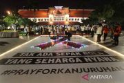 Warga meletakkan bunga saat doa bersama di Balai Kota Surabaya, Jawa Timur, Selasa (4/10/2022) malam. Doa bersama itu untuk para korban tragedi kerusuhan di Stadion Kanjuruhan, Malang. ANTARA FOTO/Didik Suhartono/rwa.