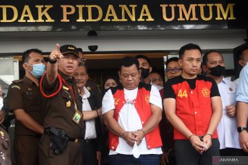 Dua tersangka kasus pembunuhan berencana Brigadir J, Kuwat Maruf (tengah) dan Ricky Rizal (kedua kanan) ditunjukkan petugas saat proses pelimpahan berkas perkara tahap dua di Gedung Kejaksaan Agung, Jakarta, Rabu (5/10/2022). Penyidik Bareskrim Polri menyerahkan 11 tersangka dan barang bukti kepada Kejaksaan Agung dalam pelimpahan tahap dua terkait kasus pembunuhan berencana Brigadir J dan "obstruction of justice" yang salah satunya menjerat mantan Kadiv Propam Ferdy Sambo. ANTARA FOTO/Indrianto Eko Suwarso/hp.