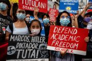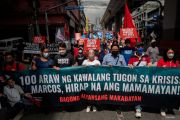 Aktivis Filipina memegang baner tulisan saat aksi protes menandai 100 hari pertama Presiden Filipina Ferdinand Marcos Jr menjabat, di Manila, Filipina, Sabtu (8/10/2022). ANTARA FOTO/Reuters-Lisa Marie David/hp.