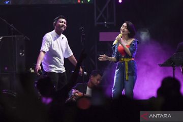 Penyanyi Denny Caknan (kiri) berduet dengan penyanyi Wika Salim saat tampil pada hari kedua Synchronize Fest 2022 di Gambir Expo Kemayoran, Jakarta, Sabtu (8/10/2022). Penyanyi pop jawa dan koplo itu menghibur penonton dengan membawakan beberapa lagu seperti 'Pamer Bojo', "Sugeng Dalu", dan "Kertonyono Medot Janji'. ANTARA FOTO/Hafidz Mubarak A/foc.