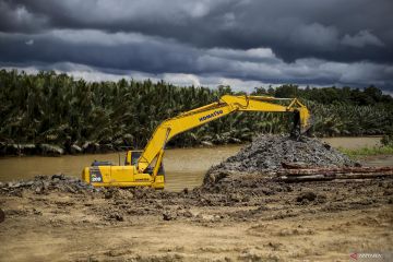 Pekerja menggarap proyek jalur logistik dan material khusus untuk pembangunan Ibu Kota Negara (IKN) Nusantara di pelabuhan masyarakat Desa Bumi Harapan, Kecamatan Sepaku, Kabupaten Penajam Paser Utara, Kalimantan Timur, Senin (10/10/2022). Kementerian Perhubungan menetapkan empat pelabuhan yang ada di Kecamatan Sepaku sebagai pelabuhan khusus pengiriman material dan logistik pembangunan Ibu Kota Negara (IKN) Nusantara, salah satunya di wilayah Bumi Harapan dan Trunen. ANTARA FOTO/Rivan Awal Lingga/foc.