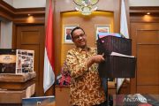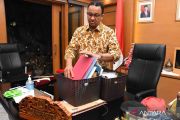 Gubernur DKI Jakarta Anies Baswedan merapikan beberapa berkas dan buku di ruang kerjanya, Balai Kota Jakarta, Jumat (14/10/2022). Anies akan purnatugas sebagai Gubernur DKI Jakarta pada Minggu (16/10). ANTARA FOTO/Indrianto Eko Suwarso/wsj.