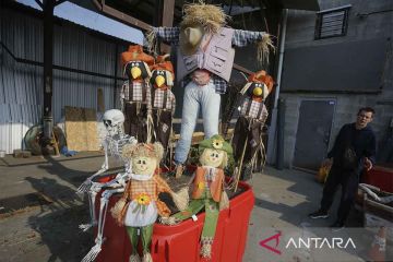 Instalasi bertema Halloween dipajang di luar sebuah toko di Vancouver, British Columbia, Kanada, Senin (17/10/2022). ANTARA FOTO/Xinhua/Liang Sen/rwa.