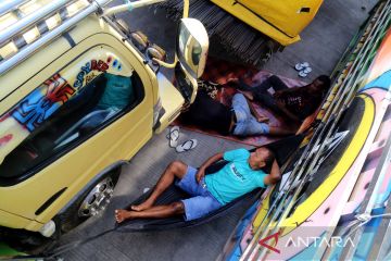 Sejumlah sopir pengangkut sembako lintas Halmahera beristirahat dekat truknya saat aksi mogok beroperasi di Pelabuhan Ferry, Bastiong, Maluku Utara, Rabu (19/10/2022). Aksi mogok tersebut sebagai bentuk protes atas kelangkaan BBM bersubsidi jenis solar di pasaran sehingga mereka kesulitan mendapatkannya. ANTRA FOTO/Andri Saputra/aww.