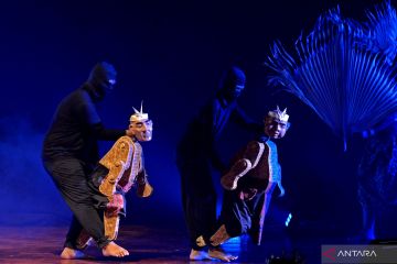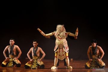 Seniman mementaskan pertunjukan teater boneka bertajuk Danuraga di Taman Budaya Bali, Denpasar, Bali, Jumat (21/10/2022). Pertunjukan teater boneka kolaborasi kelompok Papermoon Puppet Theatre, Ental Puppet Theatre serta Sunar Puppet Theatre itu dipentaskan dalam rangkaian Festival Seni Bali Jani 2022. ANTARA FOTO/Fikri Yusuf/foc.