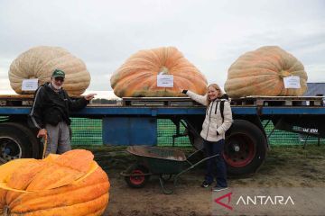 Sejumlah staf mengeluarkan isi labu untuk ajang regata labu di Desa Lichtaart, Kasterlee, Belgia, Minggu (23/10/2022). Regata labu edisi ke-13 merupakan sebuah kompetisi kayak di Belgia, yang mengharuskan para peserta untuk duduk dan berkompetisi di dalam labu berukuran besar yang dikeluarkan isinya. ANTARA FOTO/Xinhua/Zheng Huansong/rwa.