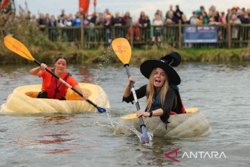 Orang-orang berkompetisi dalam ajang regata labu di Desa Lichtaart, Kasterlee, Belgia, Minggu (23/10/2022). Setiap labu yang digunakan dalam kompetisi tersebut berbobot ratusan kilogram. ANTARA FOTO/Xinhua/Zheng Huansong/rwa.