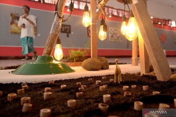 Pengunjung memperhatikan karya pada pameran seni rupa "Satoe Garis" di Museum Negeri Pemprov Sulut, Manado, Sulawesi Utara, Jumat (28/10/2022). Pameran dalam rangka peringatan hari Sumpah Pemuda tersebut menampilkan 32 karya seni lukis dan 5 karya seni instalasi yang mengangkat beragam isu di masyarakat. ANTARA FOTO/Adwit B Pramono/hp.