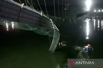 Kondisi jembatan gantung yang roboh di Morbi, India, Minggu (30/10/2022). Sebanyak 30 orang dilaporkan tewas dalam peristiwa tersebut. ANTARA FOTO/REUTERS/Stringer/rwa.