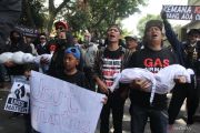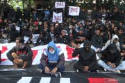 Warga dan suporter Arema FC (Aremania) berunjuk rasa di depan kantor Kejaksaan Negeri Malang, Jawa Timur, Senin (31/10/2022). Selain menuntut pihak Kejaksaan Tinggi Jawa Timur menolak pelimpahan berkas perkara tragedi Kanjuruhan dari Kepolisian yang dinilai penuh kejanggalan, mereka juga meminta aparat penegak hukum terus mengadakan pengembangan penyelidikan dan tidak selesai dengan enam tersangka saja. ANTARA FOTO/Ari Bowo Sucipto/foc.