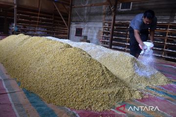 Pekerja memindahkan kacang kedelai setelah dilakukan pencucian untuk pembuatan tempe di salah satu Industri Kecil Menengan (IKM), Desa Tanjung, Kecamatan Ingin Jaya, Kabupaten Aceh Besar, Aceh, Senin (31/10/2022). Pengusaha tempe di daerah itu menyatakan harga kacang kedelai impor yang terus mengalami kenaikan dan saat ini seharga Rp14.500 per kilogram dari sebelumnya Rp10.600 perkilogram memaksa mereka mengurangi ukuran tempe guna menjaga permintaan pasar, sedangkan harga penjualan tempe masih bertahan Rp1.200 per bungkus. ANTARA FOTO/Ampelsa/rwa.