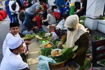Pengunjung antre nasi pecel gratis saat Peringatan Hari Jadi ke-77 Provinsi Jawa Timur di Kota Madiun, Jawa Timur, Sabtu (5/11/2022). Pada perayaan tersebut diisi dengan kegiatan jalan sehat, makan nasi pecel gratis, pelayanan publik dan pembagian bibit tanaman produktif. ANTARA FOTO/Siswowidodo/hp.