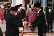 Presiden Joko Widodo (kanan) menyerahkan plakat kepada keluarga almarhum Dr. dr. H.R. Soeharto saat acara penganugerahan gelar pahlawan nasional di Istana Negara, Jakarta, Senin (7/11/2022). Presiden Joko Widodo menganugerahkan gelar pahlawan nasional kepada almarhum Dr. dr. H.R. Soeharto asal Jawa Tengah, almarhum K.G.P.A.A. Paku Alam VIII asal DIY, almarhum dr. Raden Rubini Natawisastra dari Kalimantan Barat, almarhum H. Salahuddin bin Talibuddin dari Maluku Utara serta almarhum K.H. Ahmad Sanusi dari Jawa Barat. ANTARA FOTO/Akbar Nugroho Gumay/foc.