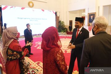 PENGANUGERAHAN PAHLAWAN NASIONAL. Presiden Joko Widodo (kanan) berbincang dengan keluarga pahlawan nasional usai acara penganugerahan gelar pahlawan nasional di Istana Negara, Jakarta, Senin (7/11/2022). Presiden Joko Widodo menganugerahkan gelar pahlawan nasional kepada almarhum Dr. dr. H.R. Soeharto asal Jawa Tengah, almarhum K.G.P.A.A. Paku Alam VIII asal DIY, almarhum dr. Raden Rubini Natawisastra dari Kalimantan Barat, almarhum H. Salahuddin bin Talibuddin dari Maluku Utara serta almarhum K.H. Ahmad Sanusi dari Jawa Barat. ANTARA FOTO/Akbar Nugroho Gumay/foc.