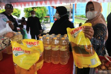 Warga antre untuk membeli kebutuhan bahan pokok saat Pasar Pangan Murah di depan kantor Samsat Indramayu, Jawa Barat, Selasa (8/11/2022). Acara yang diadakaan oleh Pemerintah Provinsi Jawa Barat itu serentak dilaksanakan di berbagai daeah di Jabar sebagai upaya stabilisasi pasokan, harga pangan, dan peringatan hari pangan sedunia. ANTARA FOTO/Dedhez Anggara/hp.