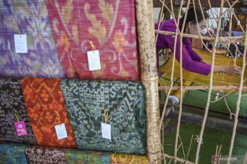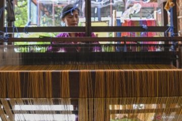 Perajin menyelesaikan pembuatan kain tenun Endek dengan menggunakan Alat Tenun Bukan Mesin (ATBM) di pusat suvenir KTT G20 di Bali Collection, kawasan ITDC, Nusa Dua, Badung, Bali, Jumat (11/11/2022). Kain tenun Endek khas Bali tersebut per lembarnya dijual dengan harga Rp150 ribu hingga Rp550 ribu tergantung motif dan tingkat kesulitan pembuatannya. ANTARA FOTO/Media Center G20 Indonesia/M Risyal Hidayat/foc.