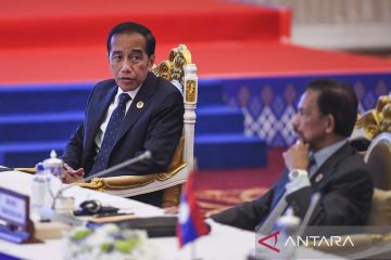 Presiden Joko Widodo (kiri) berbincang dengan Perdana Menteri Brunei Darussalam Hassanal Bolkiah saat menghadiri Konferensi Tingkat Tinggi (KTT) ASEAN - AS dalam rangkaian KTT ASEAN 2022 di Hotel Sokha, Phnom Penh, Kamboja, Sabtu (12/11/2022). KTT ASEAN - AS di antaranya membahas kemitraan Amerika Serikat dengan negara-negara di Asia Tenggara. ANTARA FOTO/Hafidz Mubarak A/aww.