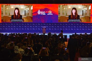 Peserta menyimak paparan dari UN Women Goodwill Ambassador Anne Hathaway yang ditampilkan dalam layar video pada B20 Summit Indonesia 2022 di BNDCC, Nusa Dua, Kabupaten Badung, Bali, Senin (14/11/2022). ANTARA FOTO/MEDIA CENTER G20 INDONESIA/Zabur Karuru/foc.