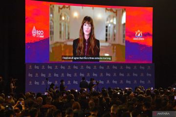 Layar digital menampilkan UN Women Goodwill Ambassador Anne Hathaway saat menyampaikan paparannya secara virtual dalam Sesi Pleno XII B20 Summit Indonesia 2022 di BNDCC, Nusa Dua, Kabupaten Badung, Bali, Senin (14/11/2022). ANTARA FOTO/Media Center G20 Indonesia/Aditya Pradana Putra/foc.