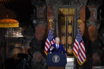 Presiden Amerika Serikat Joe Biden memberikan keterangan kepada media di Nusa Dua, Bali, Senin (14/11/2022). Presiden Joe Biden menyampaikan sejumlah isu terkait kunjungannya di KTT G20 serta hasil pertemuan bilateralnya dengan Presiden China Xi Jinping. ANTARA FOTO/Media Center G20/Akbar Nugroho Gumay/foc.