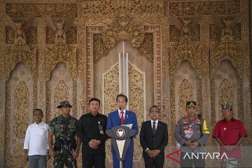 Presiden Joko Widodo (tengah) didampingi Mensesneg Pratikno (ketiga kanan), Kepala BIN Budi Gunawan (ketiga kiri), Panglima TNI Jenderal TNI Andika Perkasa (kedua kiri), Kapolri Jenderal Pol Lisyto Sigit Prabowo (kedua kanan), Gubernur Bali I Wayan Koster (kanan) dan Kepala BKPM Bahlil Lahadalia (kiri) memberi keterangan pers di VVIP I Bandara I Gusti Ngurah Rai, Badung, Bali, Kamis (17/11/2022). Presiden bertolak menuju Bangkok, Thailand untuk menghadiri KTT APEC ke-29. ANTARA FOTO/M Risyal Hidayat/rwa.