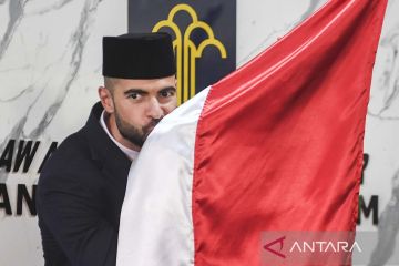 Pesepak bola Jordi Amat mencium Bendera Merah Putih usai membacakan Sumpah Janji Setia Pewarganegaraan di Kantor Wilayah Kemenkum HAM DKI Jakarta, Kamis (17/11/2022). Pesepak bola naturalisasi asal Belanda, Sandy Walsh dan pesepak bola naturalisasi asal Spanyol, Jordi Amat resmi menjadi Warga Negara Indonesia (WNI) setelah prosesi pengucapan sumpah yang kemudian berpeluang untuk membela Timnas Indonesia di Piala AFF 2022 pada Desember mendatang. ANTARA FOTO/Hafidz Mubarak A/aww.