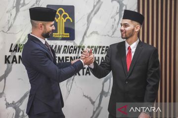 Pesepak bola Sandy Walsh (kanan) dan Jordi Amat (kiri) berjabat tangan usai membacakan Sumpah Janji Setia Pewarganegaraan di Kantor Wilayah Kemenkum HAM DKI Jakarta, Kamis (17/11/2022). Pesepak bola naturalisasi asal Belanda, Sandy Walsh dan pesepak bola naturalisasi asal Spanyol, Jordi Amat resmi menjadi Warga Negara Indonesia (WNI) setelah prosesi pengucapan sumpah yang kemudian berpeluang untuk membela Timnas Indonesia di Piala AFF 2022 pada Desember mendatang. ANTARA FOTO/Hafidz Mubarak A/aww.