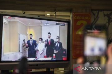 Layar menampilkan pesepak bola Sandy Walsh dan Jordi Amat membacakan Sumpah Janji Setia Pewarganegaraan di Kantor Wilayah Kemenkum HAM DKI Jakarta, Kamis (17/11/2022). Pesepak bola naturalisasi asal Belanda, Sandy Walsh dan pesepak bola naturalisasi asal Spanyol, Jordi Amat resmi menjadi Warga Negara Indonesia (WNI) setelah prosesi pengucapan sumpah yang kemudian berpeluang untuk membela Timnas Indonesia di Piala AFF 2022 pada Desember mendatang. ANTARA FOTO/Hafidz Mubarak A/aww.