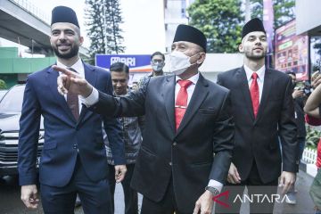 Pesepak bola Sandy Walsh (kanan), Jordi Amat (kiri) dan Ketua Umum PSSI Mochamad Iriawan (kanan) berjalan bersama sebelum membacakan Sumpah Janji Setia Pewarganegaraan di Kantor Wilayah Kemenkum HAM DKI Jakarta, Kamis (17/11/2022). Pesepak bola naturalisasi asal Belanda, Sandy Walsh dan pesepak bola naturalisasi asal Spanyol, Jordi Amat resmi menjadi Warga Negara Indonesia (WNI) setelah prosesi pengucapan sumpah yang kemudian berpeluang untuk membela Timnas Indonesia di Piala AFF 2022 pada Desember mendatang. ANTARA FOTO/Hafidz Mubarak A/aww.