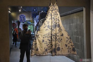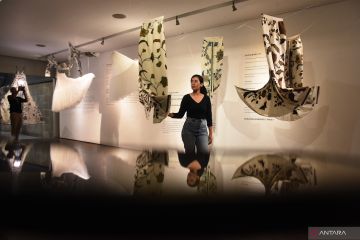 Pengunjung mengamati seni instalasi pada pameran bertajuk ÒThe Instalation Lorong WaktuÓ di Dia.Lo.Gue Artspace, Jakarta, Jumat (18/11/2022). LAKON Indonesia berkolaborasi dengan seniman Adi Purnomo dari Mamo Studio memamerkan seni instalasi ÒThe Instalation Lorong WaktuÓ yang menceritakan sebuah perjalanan pelestarian budaya yang telah berlangsung selama lebih dari empat tahun sebagai respon terhadap banyak hal yang terjadi di sekeliling serta tentang keseimbangan dan menciptakan kemungkinan baru. ANTARA FOTO/Indrianto Eko Suwarso/hp.