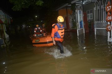 Tim SAR berjalan melewati jalan yang terendam banjir saat akan mengevakuasi warga di Perumnas Sudiang, Makassar, Sulawesi Selatan, Jumat (18/11/2022). Hujan dengan intensitas tinggi yang mengguyur Kota Makassar mengakibatkan banjir di sejumlah pemukiman dan ruas jalan. ANTARA FOTO/Abriawan Abhe/hp.