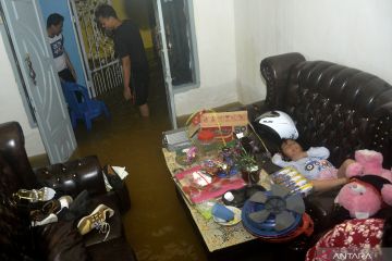 Seorang anak tertidur di sofa saat rumahnya terendam banjir di Perumnas Sudiang, Makassar, Sulawesi Selatan, Jumat (18/11/2022). Hujan dengan intensitas tinggi yang mengguyur Kota Makassar mengakibatkan banjir di sejumlah pemukiman dan ruas jalan. ANTARA FOTO/Abriawan Abhe/hp.