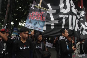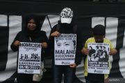 Sejumlah suporter Arema FC (Aremania) membawa poster saat berunjukrasa memblokir jalan selama dua jam di jalan Danau Toba, Malang, Jawa Timur, Minggu (20/11/2022). Unjuk rasa blokir jalan yang juga dilakukan di sejumlah titik di kota Malang tersebut dilakukan untuk memprotes aparat penegak hukum yang dinilai lamban dalam pengusutan kasus Tragedi Kanjuruhan. ANTARA FOTO/Ari Bowo Sucipto/hp.